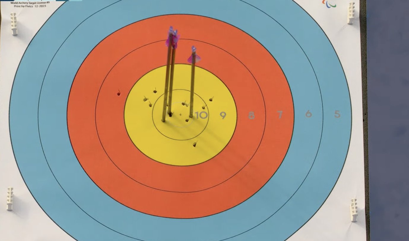 In the third end, Zuniga shoots three nines. And Sheetal squanders the advantage she gained with a 10 by shooting a 8. After three ends (nine arrows), both archers are deadlocked. Two more ends coming, which means Sheetal has six more arrows to win this contest and progress to the quarters.