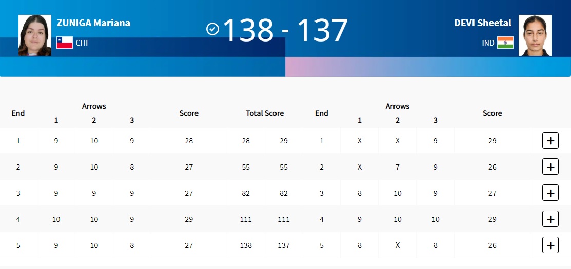 Still, both Sheetal and Zuniga were deadlocked till the final end. A nine in the first arrow by the Chilean was the difference as the Indian lost by one point.
