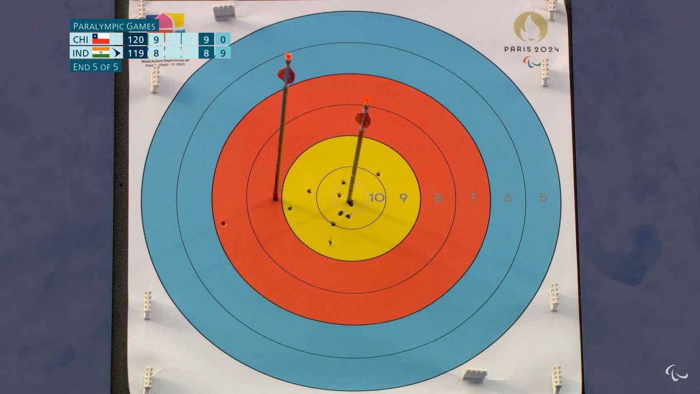 That costs Sheetal Devi. She manages to score 26 in the second end while the Chilean scores 27 to level the scores after two ends (six arrows each).