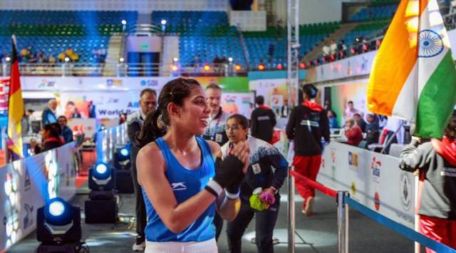 Rookie boxer Manisha Moun after winning against the United States boxer Christina Cruz in Women’s 54kg pre-quarterfinals during AIBA Women’s World Boxing Championships. (PTI Photo)