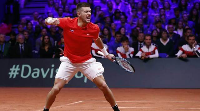 Croatia’s Borna Coric reacts as he defeats France’s Jeremy Chardy during the Davis Cup final between France and Croatia, Friday, Nov. 23, 2018 in Lille, northern France. (AP Photo)