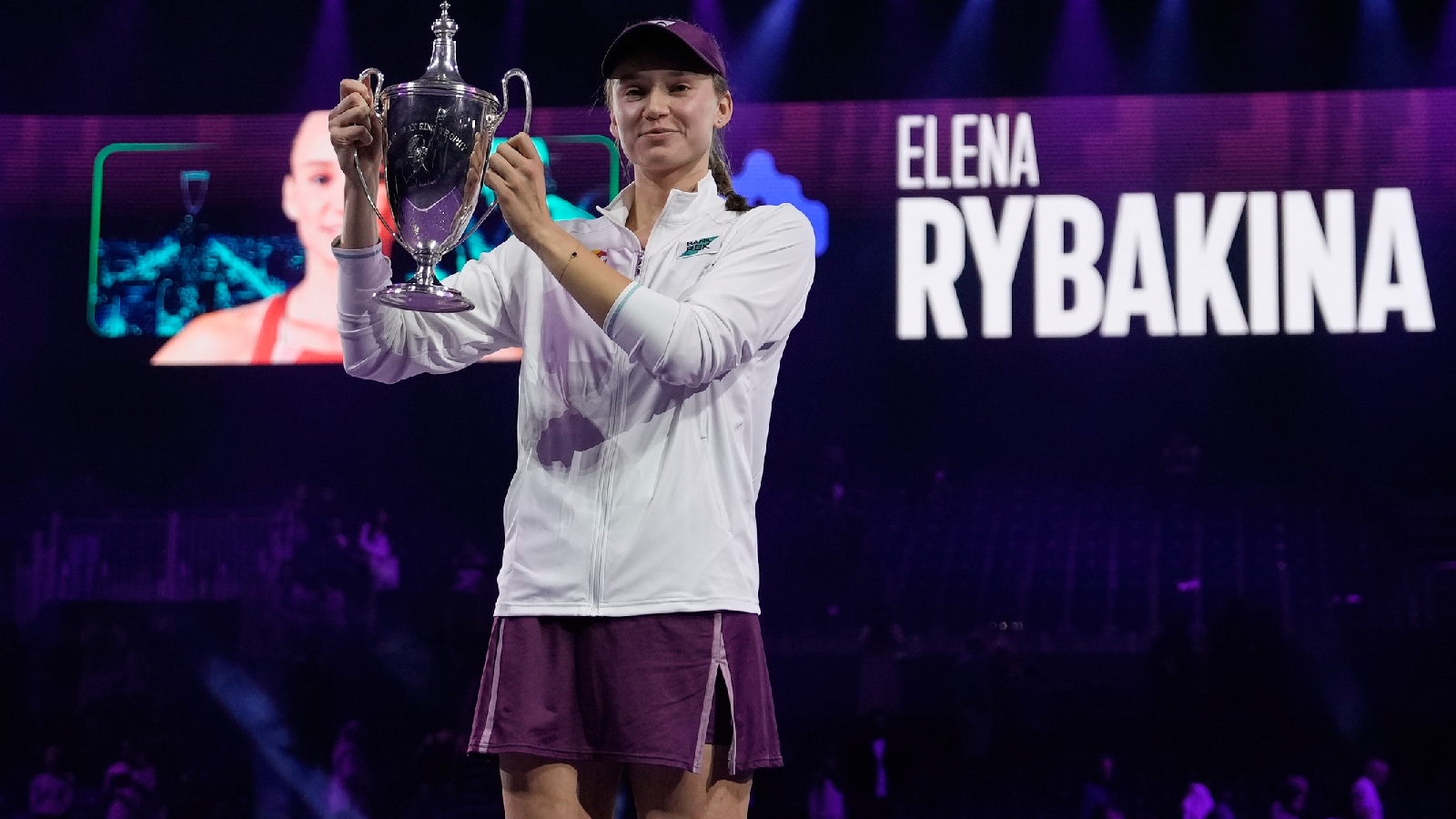 Elena Rybakina of Kazakhstan poses with the trophy after defeating Aryna Sabalenka of Belarus in the women's final singles match of the WTA finals in Riyadh, Saudi Arabia, Saturday, Nov. 8, 2025. (AP Photo/ Fatima Shbair)
