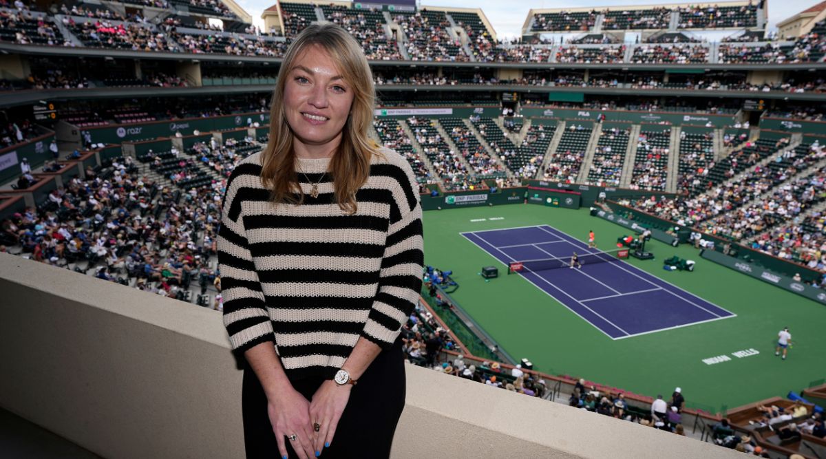Lindsay Brandon, the WTA's new director of safeguarding, poses for a portrait at the BNP Paribas Open tennis tournament Friday, March 10, 2023, in Indian Wells, Calif. The women’s professional tennis tour is increasing efforts to protect players from predatory coaches and others. (AP Photo/Mark J. Terrill)