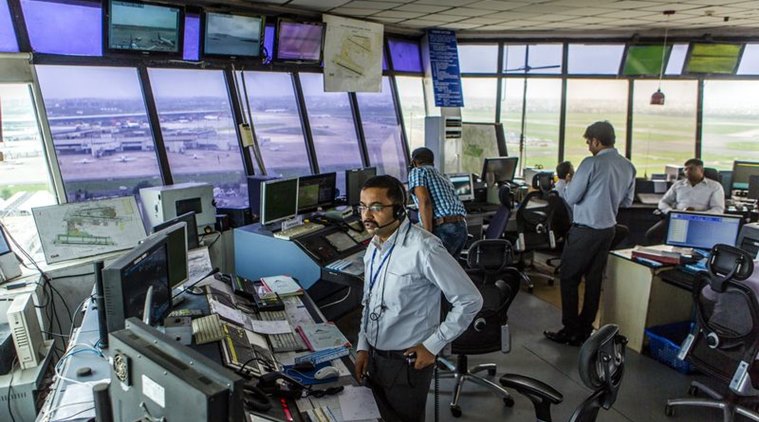 Air-traffic controllers work inside a control tower at Indira Gandhi International Airport in Delhi. (Bloomberg photo)