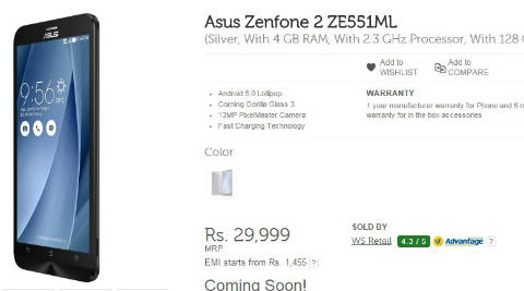 Asus recently launched four variants its Asus Zenfone 2 in India, starting from Rs 12,999. Now a fifth variant with 128 GB inbuilt storage has been spotted on Flipkart, with the listing saying that the device will launch soon. Check out the Flipkart page here. According to the Flipkart page, the Asus Zenfone 2 with 128 GB will cost Rs 29,999 and while there's no official announcement from Asus on this upcoming device, it looks like it is aimed at those who want a lot of space on their smartphone. The 128 GB variant also supports a 64GB microSD slot card, which is quite an impressive amount of space for a mobile device. Other features of the Asus Zenfone 2 with 128 GB space are the same: It has a 5.5-inch full HD display with Corning Gorilla Glass, a 13-megapixel rear camera, and a 5-megapixel front camera. The RAM is of course 4GB and the processor is the Intel Atom Z3580, Quad Core clocked at 2.3 GHz. In addition to this smartphone runs Android Lollipop and has 3000 mAh Li-Polymer battery. This smartphone has Micro SIM slot and has Dual-SIM support (GSM+LTE).