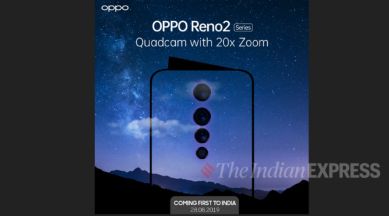 Oppo Reno 2 series will launch in India on August 28. The invite sent out by the company reveals the phone will be announced in India first and it will come with four back cameras, where the primary sensor is 48MP as well as 20x zoom. The photo also suggests a shark fin rising front camera that we saw on the Oppo Reno series, which was launched in India in May.