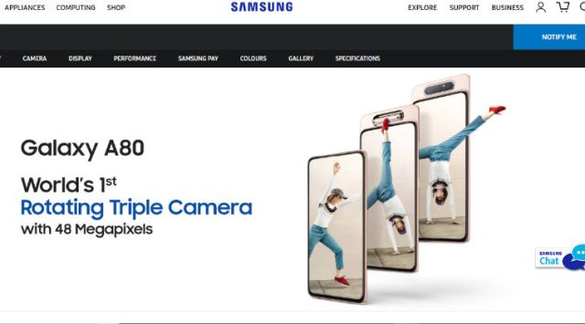 The page also lists the features and specifications of Galaxy A80, which made its global debut in April this year. It comes with a unique pop-up rotating camera system, which is also the highlight of the device. According to a SamMobile report, Samsung will host exclusive previews of the Galaxy A80 in five cities across India on June 8 and June 9.