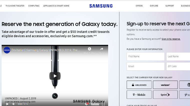 Samsung Galaxy Note 10 reservations for pre-order are open in the US and will be accepted till 11:59PM ET on August 7. Those who reserve the phone in the US can choose from carriers like T-Mobile, Sprint, A&T, Verizon, etc or simply go for the unlocked variant. The company is offering a trade-in offer as well as $50 instant credit for eligible devices and accessories.