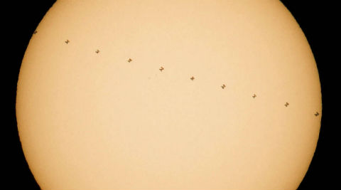 The image shows the orbital space station – considered to be the largest man-made structure ever to be built in space -transiting across the Sun.