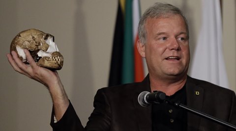 Lee Berger, a professor at the University of the Witwatersrand, holds a reconstruction of the skull of Homo naledi at Magaliesburg, South Africa, Thursday, Sept. 10, 2015. Scientists say theyve discovered a new member of the human family tree, revealed by a huge trove of bones in a barely accessible, pitch-dark chamber of a cave in South Africa, showing a surprising mix of human-like and more primitive characteristics. (AP Photo/Themba Hadebe)