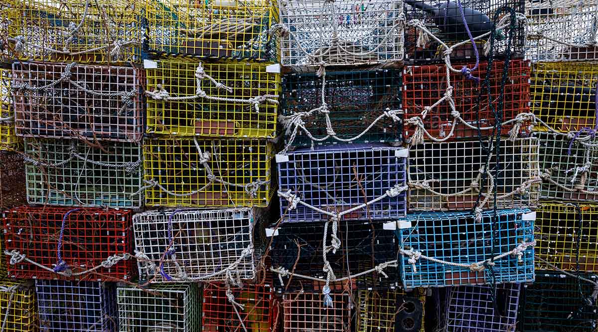 A vast majority of commercial lobster fishers still use pots, also known as traps, to catch their quarry. Pots are loaded with bait and lowered to the seafloor, where they are left to soak. To make the pots easy to recover, they are connected to a buoy floating at the surface by a vertical line of rope.