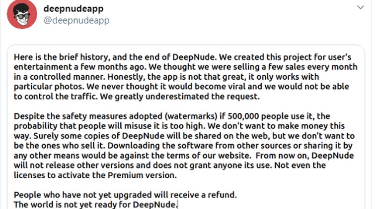 The letter ends saying ‘People who have not yet upgraded will received a refund. The world is not yet ready for DeepNude.’ The world should ideally never be ready for an app like DeepNude considering that it represents is a violation of privacy and objectifies women.