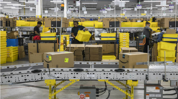 Workers at an Amazon fulfillment center in Staten Island, May 15, 2019. Some of Amazon’s warehouse employees work as social media ambassadors, responding to critical tweets about the e-commerce giant’s punishing working conditions. (Hiroko Masuike/The New York Times)