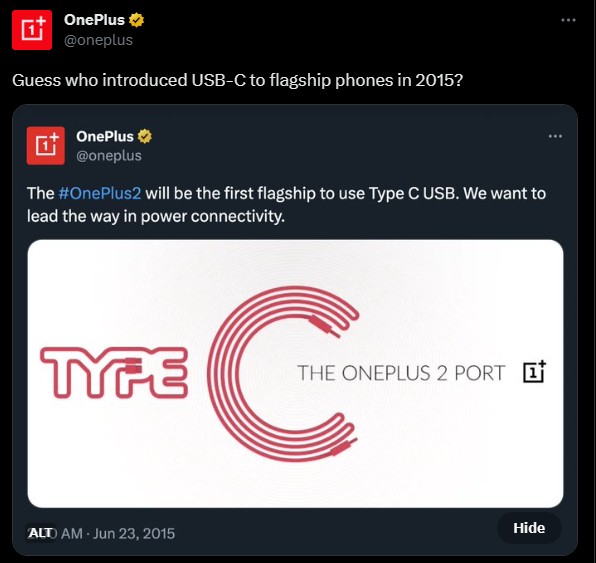 Driven by EU regulation, the iPhones are finally set to hop aboard the USB Type-C bandwagon for a more seamless charging experience across devices. Apple is obviously rather late to the party, and OnePlus has taken to Twitter to remind users just that.