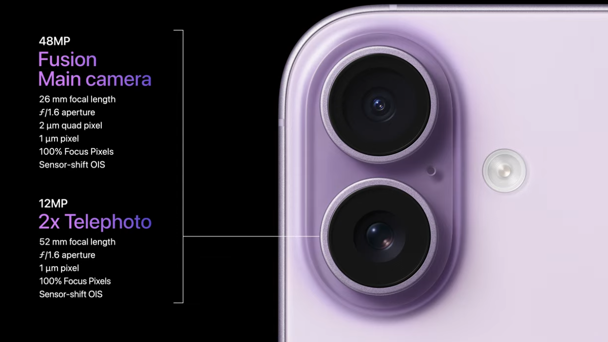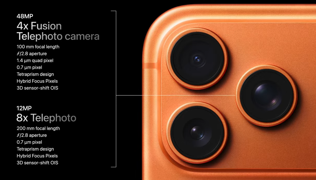 All three rear cameras are 48 MP for first time. More detailed images and zoom range. The extended plateau features an all-new telephoto camera.