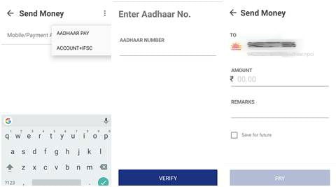 In order to make payments via Aadhaar, a user needs to tap on Send money, then on the three dots at the top of the menu. Options for Aadhaar Pay and Accounts + IFSC should open up. Tap on Aadhaar as the option, type in the number, then if it is linked to a bank account, you should be able to transfer the required amount.