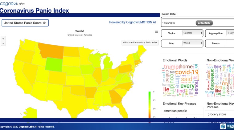 The Cognovi “Panic Index” measures people’s emotional response towards Covid-19 in realtime and it’s impact on stock markets, dining, shopping, travel and other economic activities. The Dayton, Ohio startup takes advantage of Twitris, a Wright State University-developed machine learning tool, to take a sample of social media happenings about Covid 19 and use a combination of human, machine learning and understanding of behavioral psychology to interpret the conversation and then extract sentiments about what they are searching for in real-time.