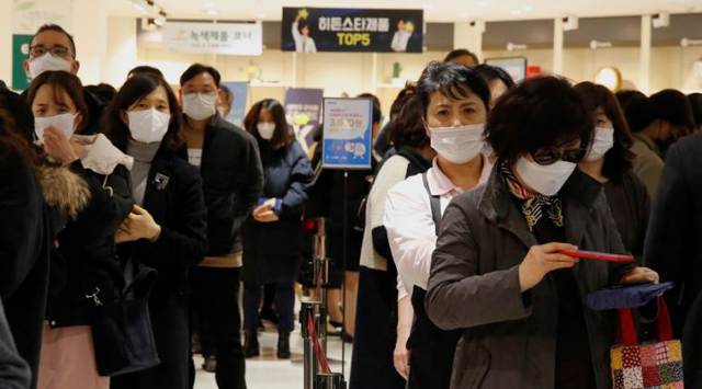 People wearing masks to prevent contracting the coronavirus wait in line to buy masks at a department store in Seoul, South Korea February 27, 2020. REUTERS/Heo Ran