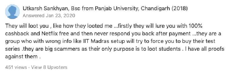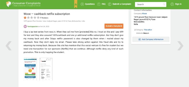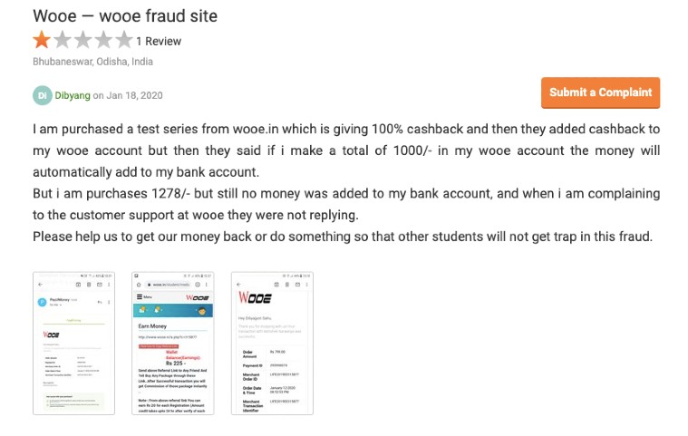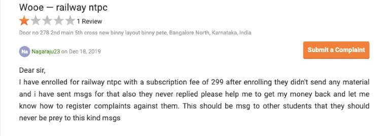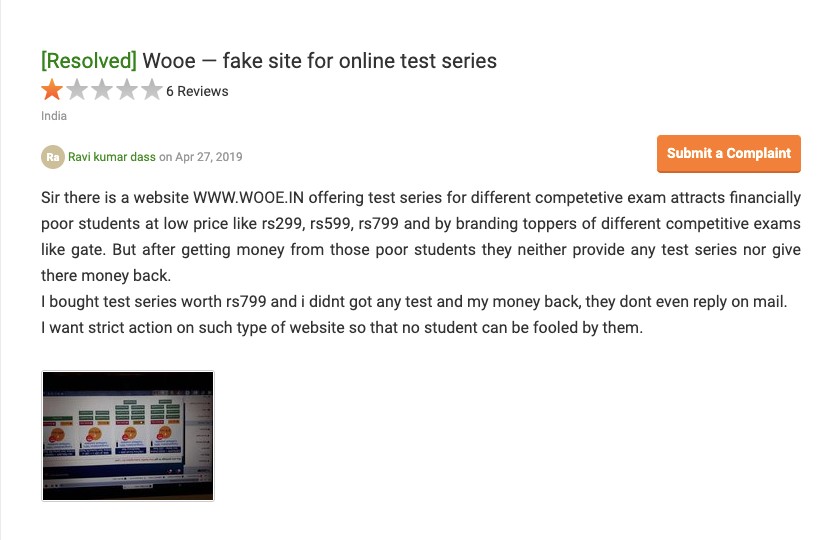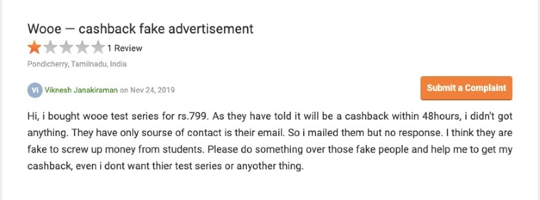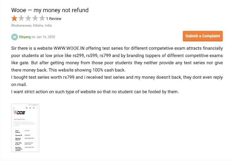 Once you click on registration link on the web page, it takes you to another website wooe.in — a fairly looking site claiming to offer test series for multiple competitive exams at a nominal fee with the promise of a refund. In my investigation, I found that the refund never really happens and the claims are false just to trick aspirants. Following are some screenshots of users who complained about the portal on Quora and consumercomplaints.in: