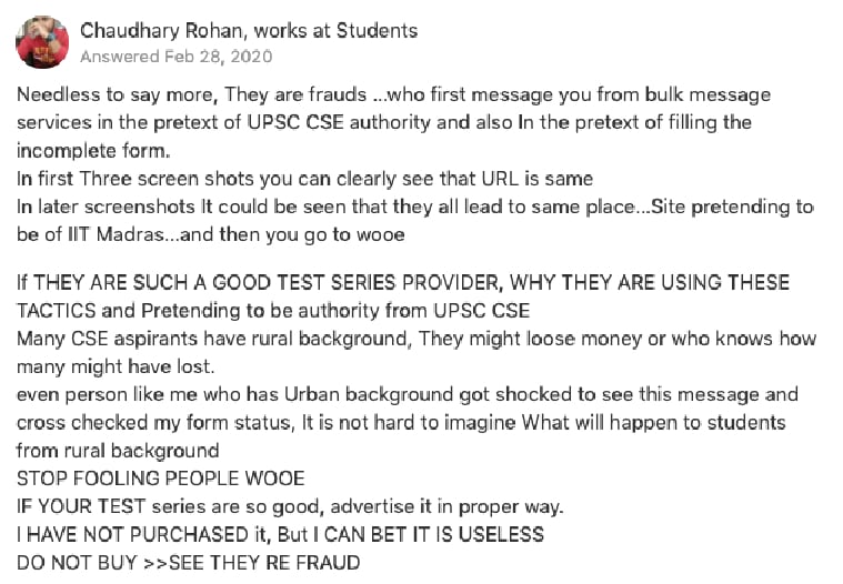 * Don’t trust random educational portals. Do your research before subscribing to any test-series or online course. In the case of Wooe, it is not easy to identify it based on its website alone but the cheap test-series amount should ring a bell in your head.