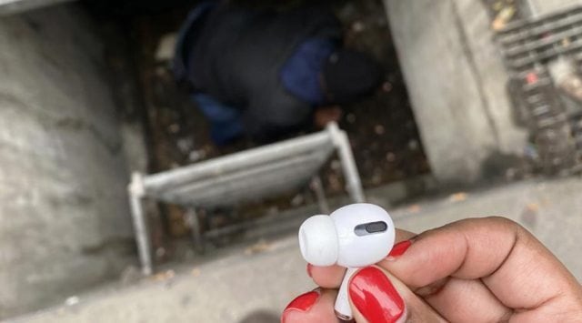 Shortly after rummaging through leaves and paper, he poked his head out of the hole and extended his hand. He was holding my AirPod.