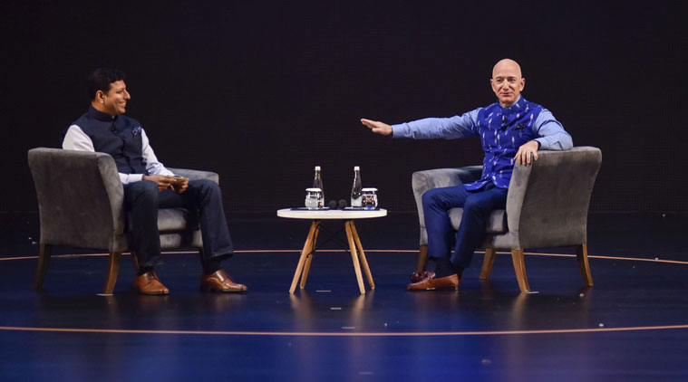 Amazon chief Jeff Bezos interacts with Amazon Global Senior Vice President Amit Agarwal during Amazon SMBhav summit, at Jawahar Lal Nehru Stadium in New Delhi, Wednesday, January, 15, 2020. (PTI Photo)