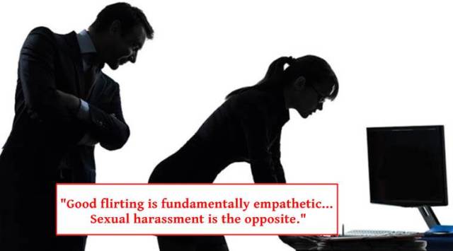 “I love to be flirted with. I don’t like being sexually harassed. These two things are not the same, and if you’re arguing the point “now men can’t flirt anymore,” you don’t understand what flirting is or you’re just pretending not to in order to set up a straw man argument in favor of sexual harassment. Good flirting is fundamentally empathetic. It’s about building desire and it’s often pretty subtle. It’s paying such deep attention to another person’s emotions and body language that you create more intimacy with them. It’s a two-way, playful, fun exchange that makes everyone feel good. Sexual harassment is the opposite. It’s devoid of empathy and it’s about forcing your will upon another person without having any regard for their desire. You’re comparing a paint brush to a wrecking ball.”