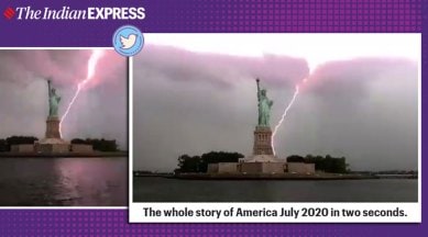 A severe thunderstorm Wednesday brought heavy rain, flashes of lightning, and thunder to the tri-state region of New York City, Newark and Jersey City. A video taken during the thunderstorm showed the moment lightning struck the Statue of Liberty and the stunning footage is now being widely shared online. Many on social media have dubbed it a ‘sign from God’ due to the current political scenario in the country.