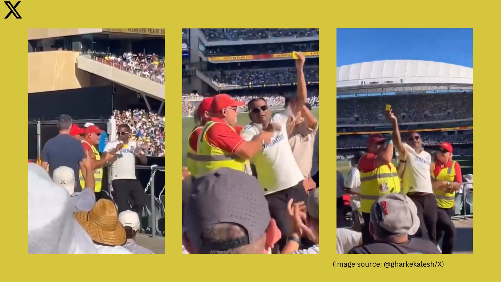 A viral video from the Adelaide Oval shows an Indian fan being escorted out by stadium security. The fan, dressed in India’s Test jersey, was reportedly seen holding a piece of sandpaper, sparking amused reactions from the crowd. As the fan was led away, spectators waved goodbye with playful jeers, capturing the lighthearted yet intense spirit of the series.