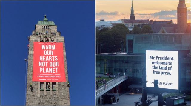 Kaius Niemi, editor-in-chief, shared a photo of one such banner and said hundreds of such reminders have been put up in the city on the routes from the airport to the summit venue. The signboards feature headlines in English and Russian from 2000-2018 detailing the respective leaders’ “turbulent” attitudes toward a free press. Other signs include messages like, “Trump calls media enemy of the people,” and his repetitive attack on news media as fake news.
