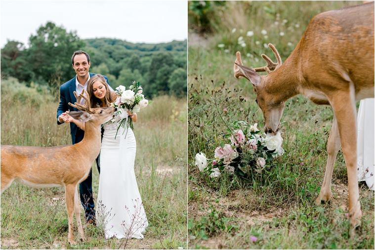 The photographer recollected that the bride was little baffled at first and decided to save her special flowers and held the bouquet up in the air. However, refusing to budge, the buck simply jumped for it.
