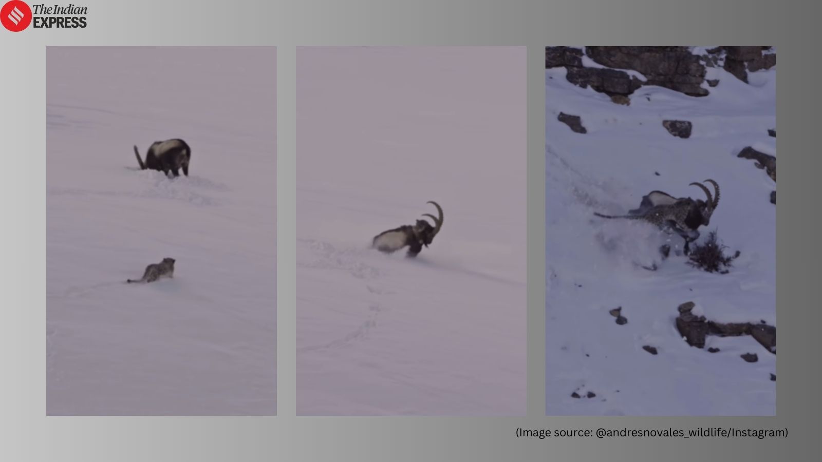 The video captures the leopard clinging to the ibex’s back as it bolts across the icy incline