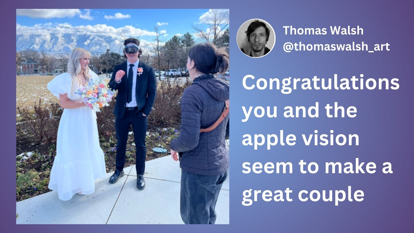 One user wrote, “Congratulations you and the apple vision seem to make a great couple.” Another added, “the bride’s face says it all.” A third user mentioned, “If that marraige lasts over a year, it will be a miracle of communication. I doubt you get it from that dude.”