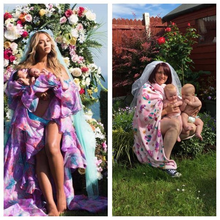 It would not be an exaggeration to say that the world is besotted with pop music superstar Beyoncé. Social media went berserk when news of her pregnancy broke and the same happened when the Lemonade singer finally posted pictures of her twins, Sir Carter and Rumi, on Instagram. In the pictures, the 35-year-old singer was seen wearing a floral dress and a long blue veil, as she cradled her month-old twins. The pictures went viral and social media could not believe how beautiful they were. Amidst all this, Sharon Kellaway, a 40-year-old homemaker from Ireland decided to ‘repeat’ the feat but in her own way. Mother of five, Kellaway did a Beyonce-like photo shoot with her five-months-old twins Senan and Zoe, where she can be seen wearing a baby blanket instead of Beyonce’s floral dress. And she chose her back garden as the setting for the photo shoot.