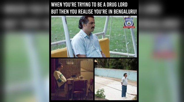 With the caption ‘Roses are red, Violets are blue, Heard you’re selling drugs, We’ll come visit you’ for a morose looking Pablo Escobar from Narcos, Bengaluru Police’s social media team has definitely got their game face on. While there is definitely no dearth in the number of warnings and safety measures that are issued by officials, people have clearly taken a liking towards their posts.