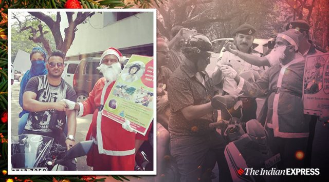 Dressed as Santa Claus and adorning white beard, two policemen were seen handing out sweets to traffic violators. They also held placards informing people about the importance of wearing a helmet.