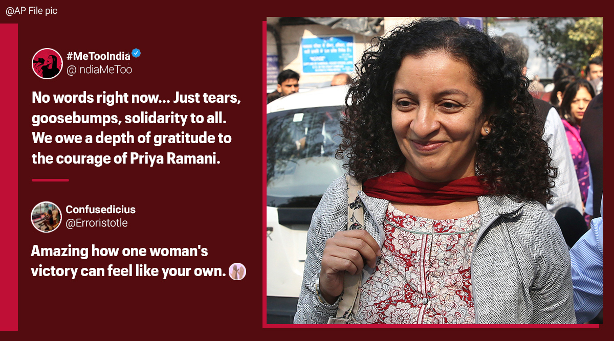 The official handle of Me Too movement in India celebrated the verdict and wrote: “We won this”. It also added in a later tweet that the court’s order was significant. “No words right now… Just tears, goosebumps, solidarity to all. We owe a depth of gratitude to the courage of Priya Ramani,” it wrote in a subsequent tweet.