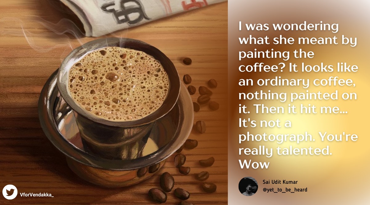 Chennai-based artist and photographer, Varuna Shreethar, took social media by storm by sharing a painting of the humble filter coffee. The picture showed piping hot coffee served in a small steel tumbler, inside the dabarah saucer in which it can be cooled, a signature utensil to serve the beverage.