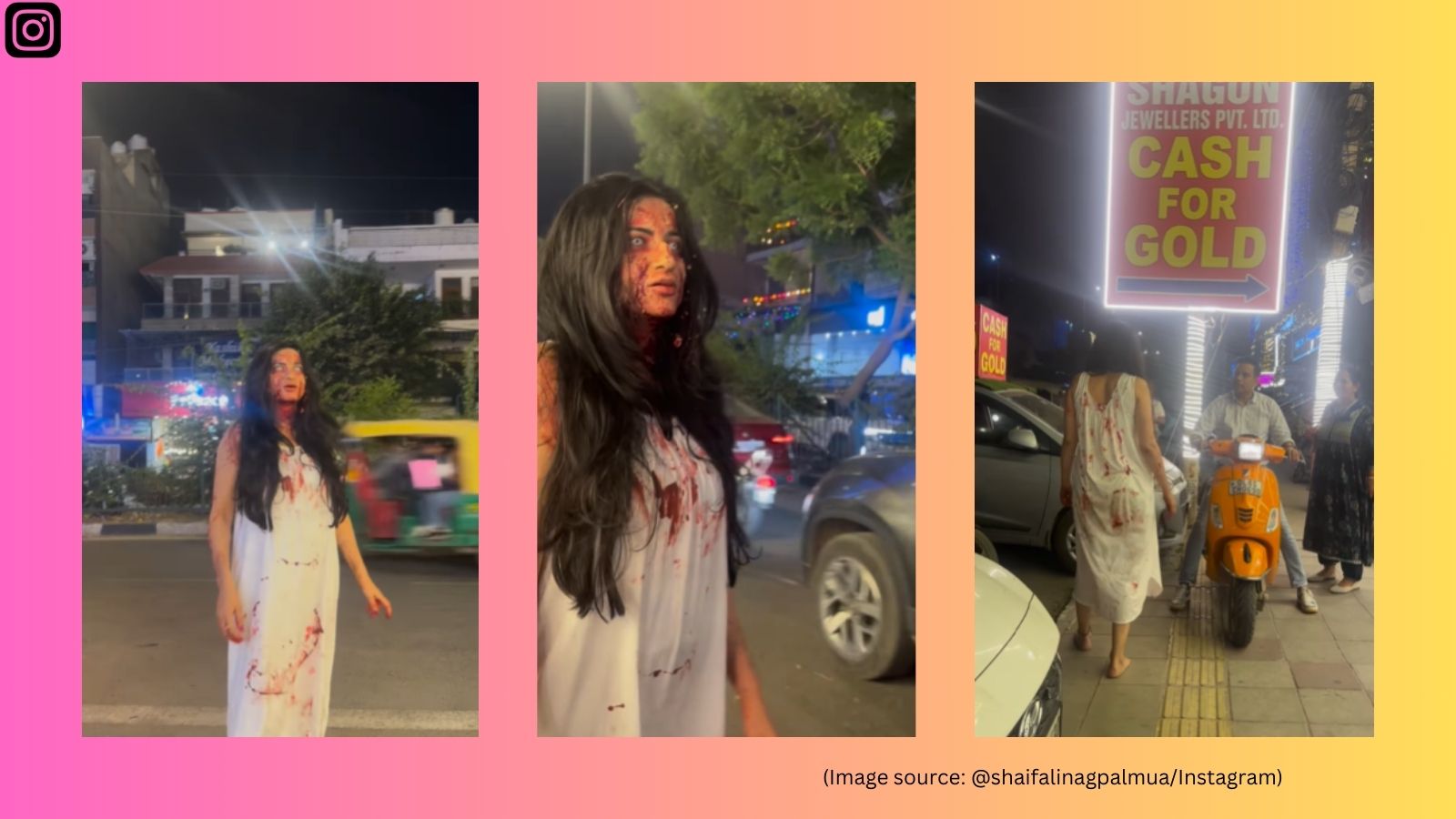 Shaifali Nagpal, a Delhi-based makeup artist, has sparked quite some reactions online with a Halloween prank that had kids and passersby in for a fright. Dressed as a “ghost,” she wore a sleeveless white dress streaked with red to resemble blood. She also wore contact lenses.