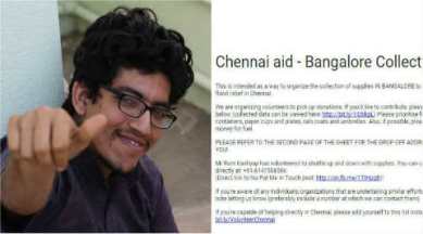 As Chennai is battling the devastating floods, thousands of people are lending a helping hand to the victims in this hour of crisis. Good Samaritans are using every means to reach out to the people of Chennai, where there is an acute shortage of essential items. Facebook and Twitter have become an effective media to arrange relief commodities. A Bengaluru resident, named Ram Kashyap, is shuttling between Bengaluru and Chennai with food supplies and other essentials items.