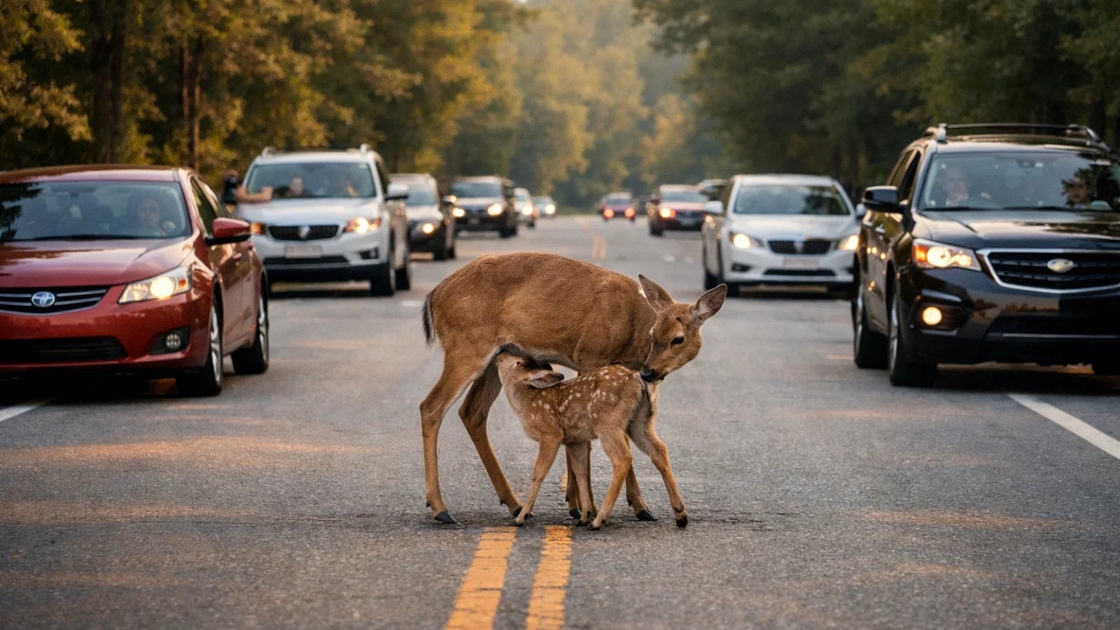 In a video that has now gone viral, the deer is seen gently feeding her calf right in the middle of the road, appearing completely relaxed despite the presence of vehicles and people nearby. Rather than honking or trying to pass through, those around chose to slow down and stop at a distance, quietly giving the animals the space they needed.