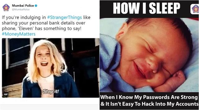 While the general notion of policemen is that of men in uniform with grim faces that mean business, Mumbai Police (and Bangalore Police Twitter accounts) have been serving law and order up on the Internet with a pinch of salt and equal parts humour. This time, they have tried to make people beware of sharing their personal bank details over the phone with a GIF from the series Stranger Things and with a meme of a baby smiling in his sleep captioned “How I sleep when I know my passwords are strong and it isn’t easy to hack into my accounts.” These are just the latest additions to Mumbai Police’s ever-expanding collection of popular culture memes, including many Game of Thrones and F.R.I.E.N.D.S references.