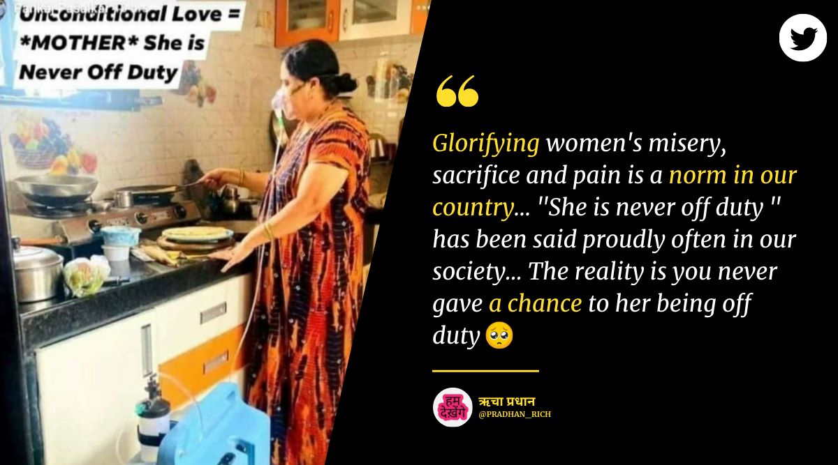 Glorifying women’s misery ,sacrifice and pain is a norm in our country… “She is never off duty ” has been said proudly often in our society… The reality is you never gave a chance to her being off duty 🥺