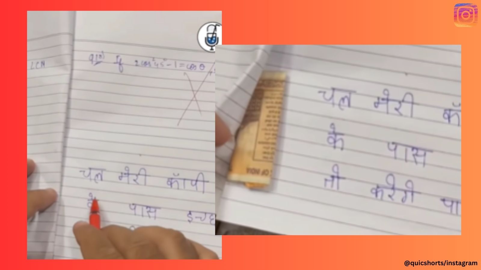 In the answer sheet, the student has just rewritten the questions. But in one of the pages, there is a note in Hindi, “My copy has been given to Guru, if he wishes then I will pass.” And right where the sheet is held in binding, a Rs 200 note was sneakily hidden.