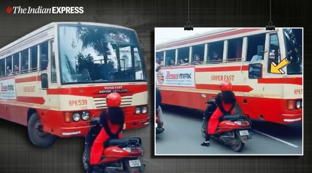 The Kerala State Road Transport Corporation (KSRTC) bus headed from Kasaragod to Kottayam initially stops, and then slowly returns to the left side of the road. Throughout, the woman stays still. Read in Malayalam