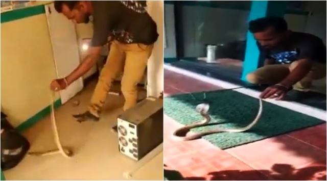 The man is seen kneeling down to get a grip on the slithery animal and pull it out from the cabinet to help it. However, being removed from his hiding the animal is seen as visible angry and tries to attack the snake-catcher several times.