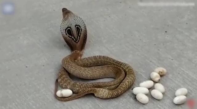 A video of a cobra laying eggs on a busy street in Karnataka has gone viral on social media. The 1.21-minute clip shows the reptile laying eggs in the middle of the street. According to a Daily Mail report, the clip was shot by a teacher in Maddur town in Karnataka, who found the snake inside his home and then took it outside.