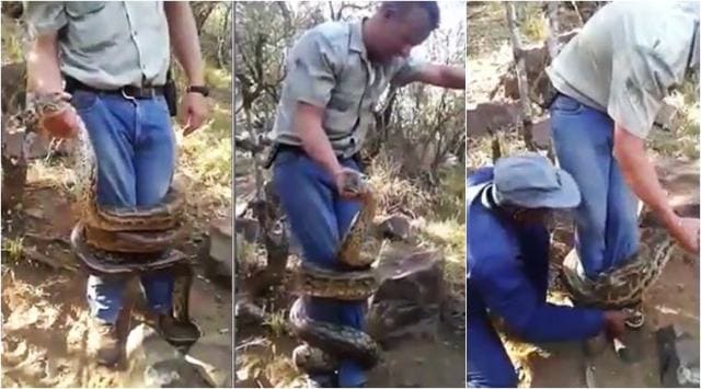 The horrific video, shot in Limpopo Province, South Africa, has scared the living daylights out of everyone on the Internet. The 1.36-minute clip shows the man coming out from an array of trees holding the neck of the snake, but even before he realises, the python starts wrapping its body around his legs to crush him — one of its customary tactics to kill its prey. The irked serpent swiftly coils hard and the man is seen losing his balance. Finally, another man steps in to release him from the deadly clutches of the non-venomous snake.