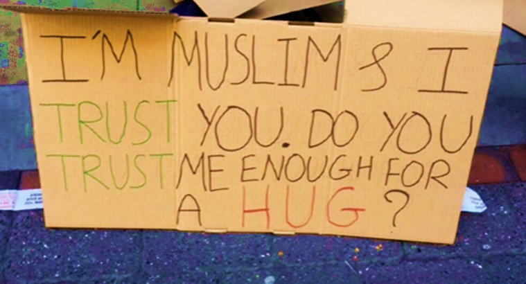 Noori stood next to a placard saying, “I’m a Muslim and I trust you. Do you trust me enough for a hug?”