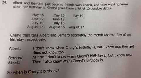 A maths problem that first appeared in a test for Singapore's elite high school students has baffled Internet users around the world after it went viral, prompting a rush of attempts to solve it. The question, involving a girl asking two boys to guess her birthday after giving them scant clues, first appeared in an April 8 test organised by the Singapore and Asian School Math Olympiads (SOSMA). It was meant for 15- and 16-year-old elite secondary school students, but swiftly went global after a local television news presenter posted it on his Facebook page Saturday. In the question, Cheryl gives her new friends Albert and Bernard 10 possible dates when they enquired about her birthday, before separately giving each of them further clues. Test-takers are then asked to use logic to deduce Cheryl's birthday using a short conversation between the two boys about the information given to them. By yesterday Internet users around the world were posting meticulously detailed answers to the puzzle on social media networks such as Facebook and Reddit, only to prompt a slew of comments disputing their findings and methodology. Others posted sardonic comments about "coy Cheryl". "Cheryl obviously didn't want Albert and Bernard at her party. Should have taken the hint when Cheryl decided to play this little game," wrote David Leong on Facebook. The "mind-boggling" problem also made the mainstream media, with leading websites including the Guardian newspaper and Buzzfeed publishing articles about the puzzle. The post also clarified earlier reports that the question was posed to primary schoolchildren, saying SOSMA thought it important to specify the age of the students involved so "Singapore parents will not start to worry so much". The question was "actually from the secondary 3 and secondary 4 SASMO contests held on April 8, 2015", it said, adding it was "meant to sift out the better students". Singapore is renowned worldwide for its national maths system, which has been emulated by schools in other developed countries and cities, including New York.